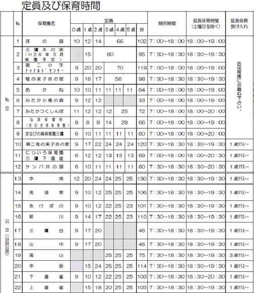 >上連雀保育園・中原保育園の0歳が消された定員及び保育時間(一部抜粋)