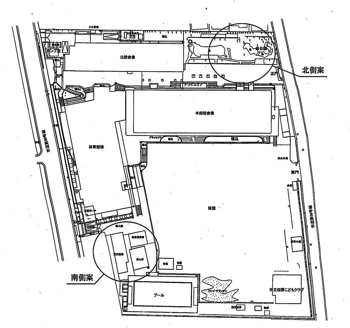 > 桜野小北側のビオトープ付近か校庭南西にある倉庫とトイレ、